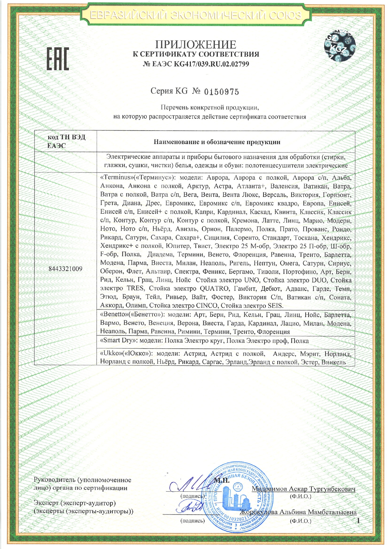 Сертификат соответствия: № ЕАЭС КС417/039.1Ш.02.02799